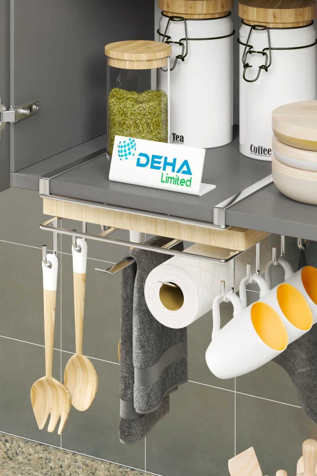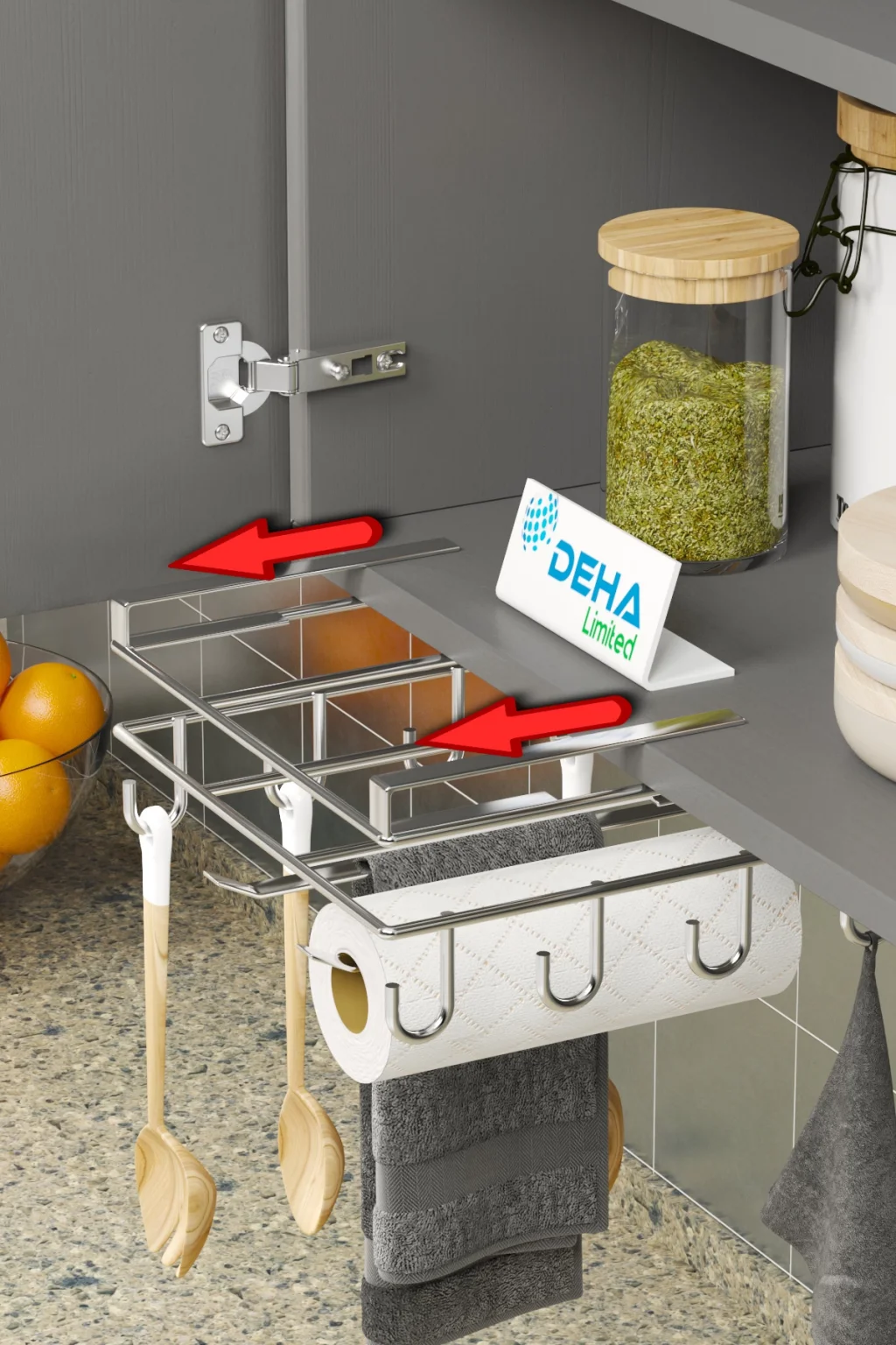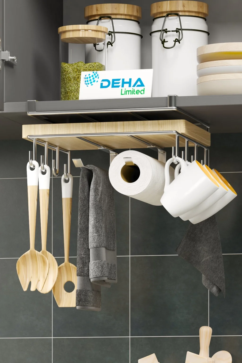 Tesgah üstü raf ayrıca kağıt havlu ve el bezlerini asmak içinde askılara sahip olup üst rafında ise kesme tahtalarınızı muhafaza edebilirsiniz.