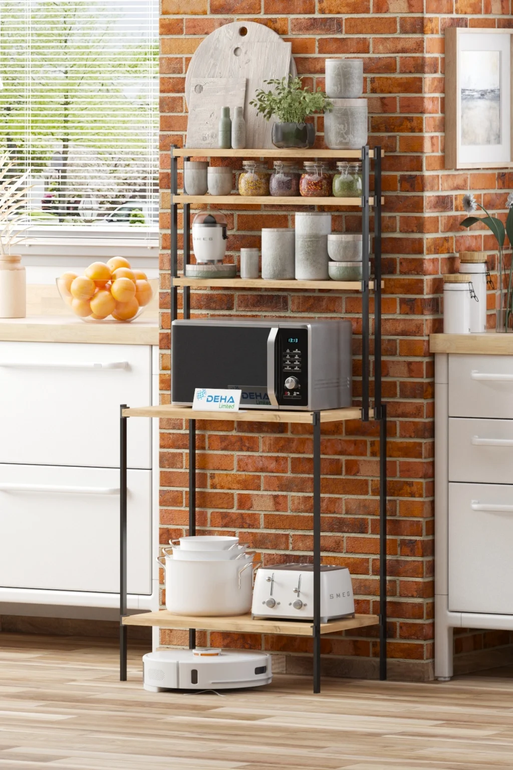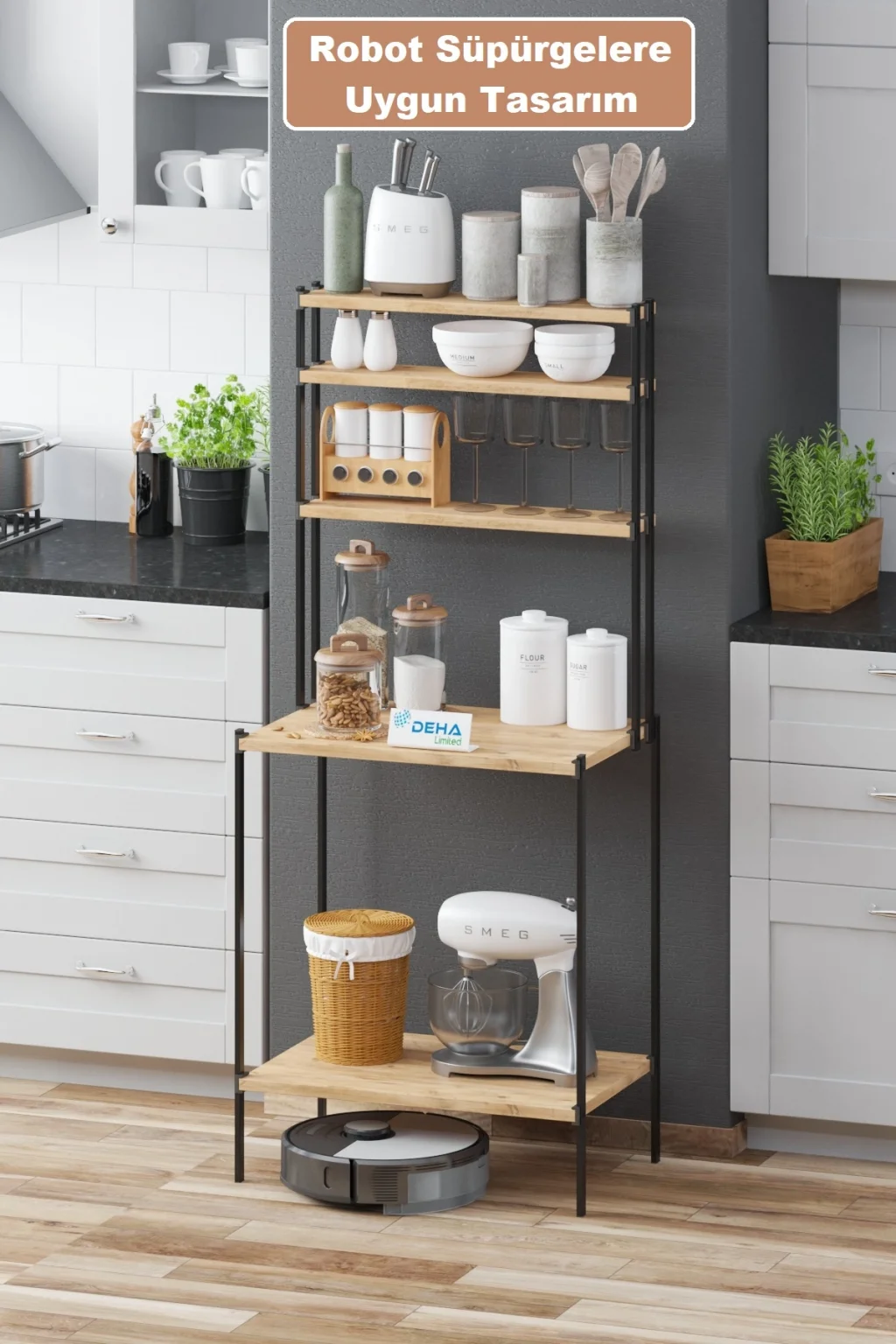 Robot süpürgelere uyumlu tasarıma sahip mutfak raflı bangosu zeminden yüksekliği 15.5cm olup bu sayede süpürgeler rahat bir şekilde zemin temizliğini yapabilmeyi kullanıcılara sunmaktadır.