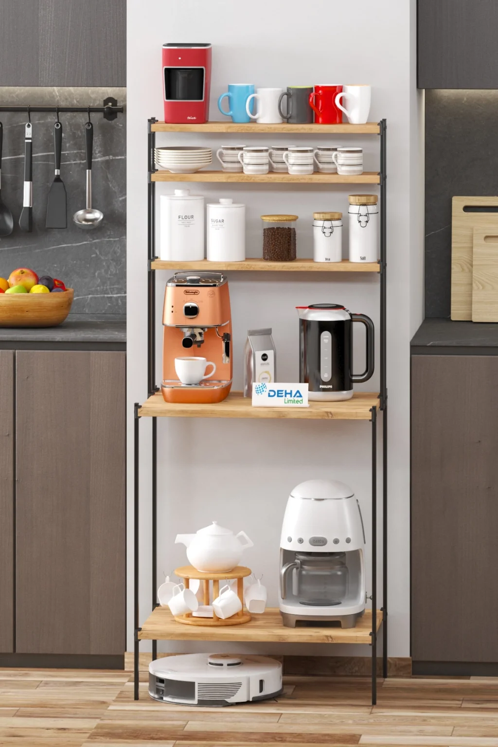 Sade ve şık tasarıma sahip mutfak raf kahve köşesi bir çok mutfak gereçlerini toparlayacak.