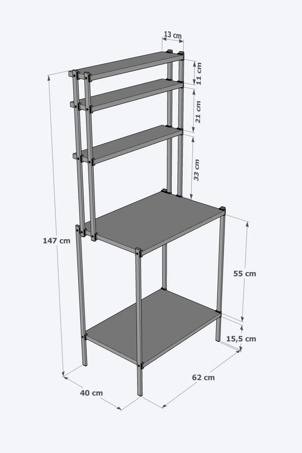 Üst Tabla Öçüsü En 60cm,Derinlik 40cm. Üst Raflar En:62cm Derinlik:13cm Masa Yükseklik: 147cm